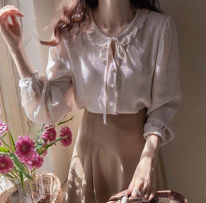 Forever Kids 正韓 女人味可襯衫可外套蓬鬆圓領排扣上衣【C60405】