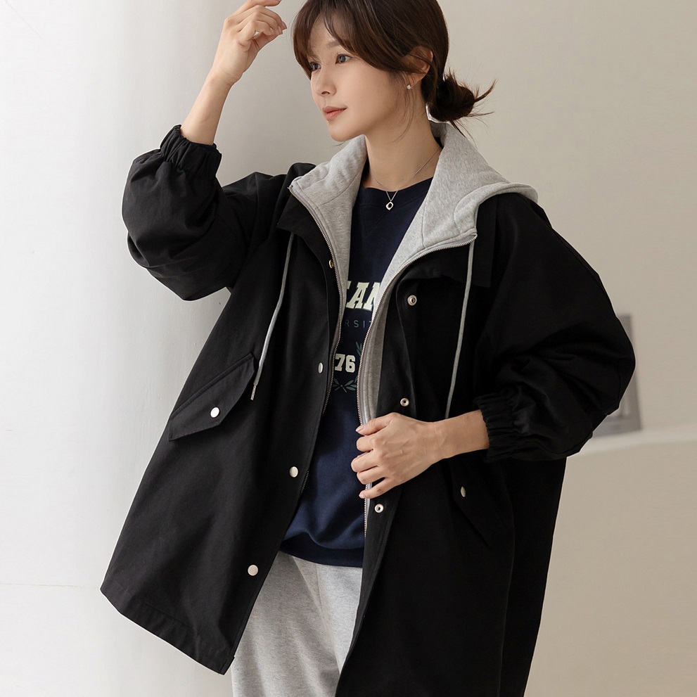 Forever Kids 正韓 層次穿搭連帽寬鬆 長版夾克外套【R62136】 | Foreverkids 韓國時尚精品、韓國代購、正韓空運、洋裝、吊帶褲、外套、針織外套、寬褲