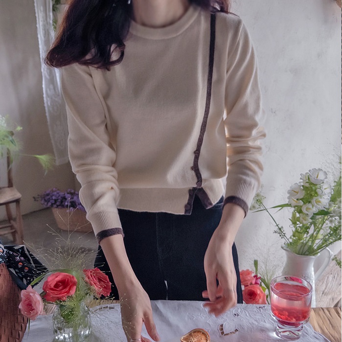 Forever Kids 正韓 柔軟拼色斜扣長袖針織上衣【A62142】 | Foreverkids 韓國時尚精品、韓國代購、正韓空運、洋裝、吊帶褲、外套、針織外套、寬褲