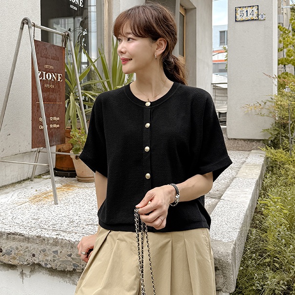Forever Kids 正韓 氣質金鈕釦 五分袖圓領針織上衣【A621252】韓國代購 | Foreverkids 韓國時尚精品、韓國代購、正韓空運、洋裝、吊帶褲、外套、針織外套、寬褲