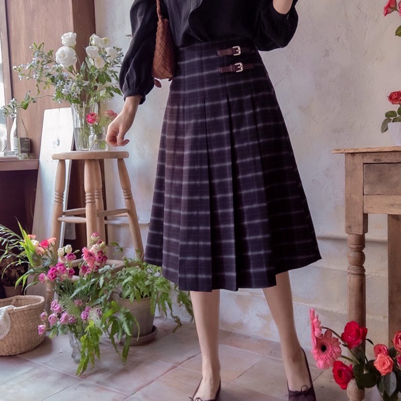 Forever Kids 正韓 秋天氣息 格紋後鬆緊腰氣質金屬皮帶長裙【CE621285】韓國代購 | Foreverkids 韓國時尚精品、韓國代購、正韓空運、洋裝、吊帶褲、外套、針織外套、寬褲