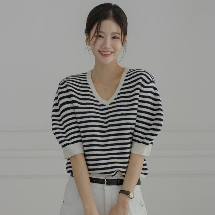 Forever Kids 正韓 小拋袖V領條紋針織上衣 短袖【T65909】 | Foreverkids 韓國時尚精品、韓國代購、正韓空運、洋裝、吊帶褲、外套、針織外套、寬褲