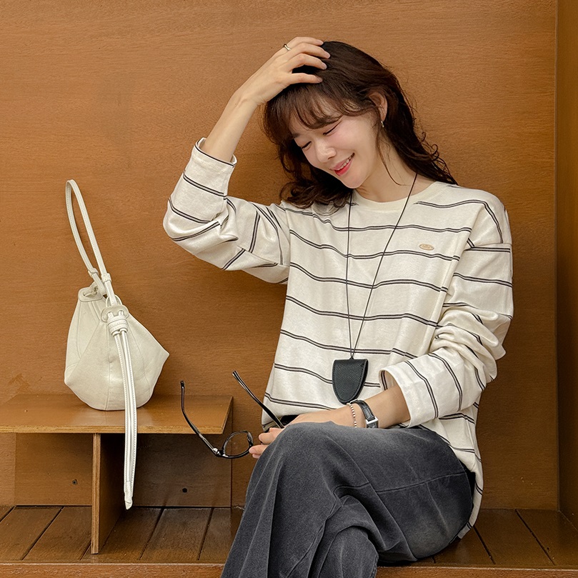 Forever Kids 正韓 金屬小標條紋圓領配色寬鬆 長版T【A621328】 | Foreverkids 韓國時尚精品、韓國代購、正韓空運、洋裝、吊帶褲、外套、針織外套、寬褲