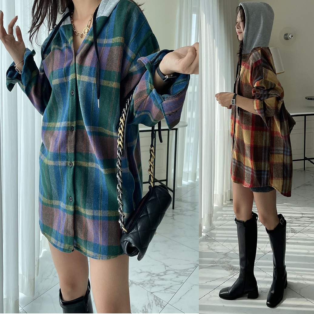 Forever Kids 正韓 磨毛連帽格紋長版襯衫外套【B621323】韓國代購 | Foreverkids 韓國時尚精品、韓國代購、正韓空運、洋裝、吊帶褲、外套、針織外套、寬褲