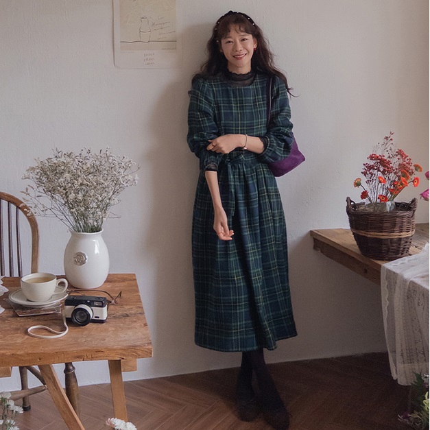 Forever Kids 正韓 秋天格紋可綁腰帶長洋裝 連身裙【A621343】 | Foreverkids 韓國時尚精品、韓國代購、正韓空運、洋裝、吊帶褲、外套、針織外套、寬褲