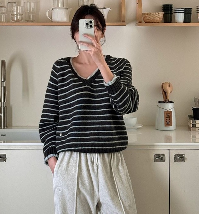 Forever Kids 正韓 簡約V領條紋針織上衣【F23291】 | Foreverkids 韓國時尚精品、韓國代購、正韓空運、洋裝、吊帶褲、外套、針織外套、寬褲