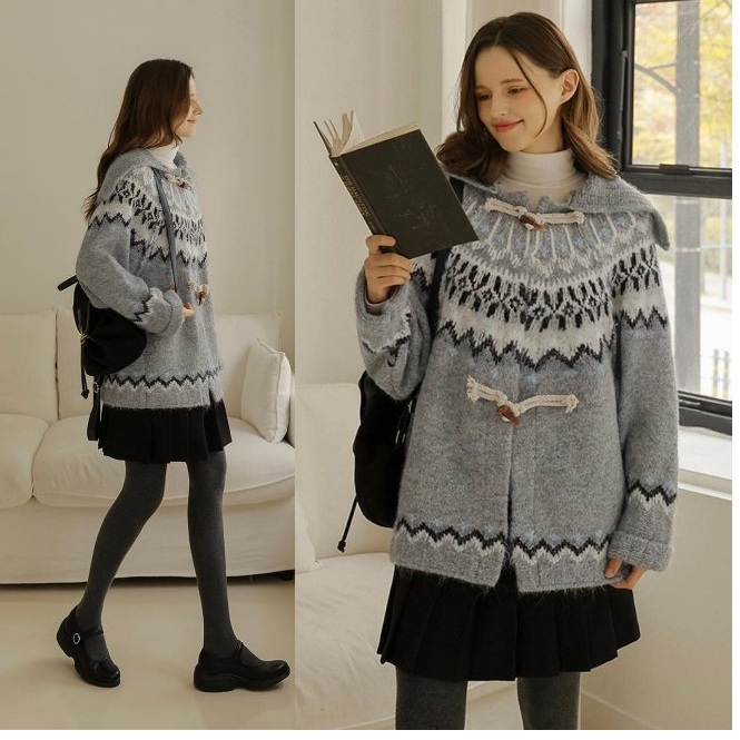 正韓 北歐圖騰印花 大翻領牛角扣針織半長外套【C622372】 | Foreverkids 韓國時尚精品、韓國代購、正韓空運、洋裝、吊帶褲、外套、針織外套、寬褲