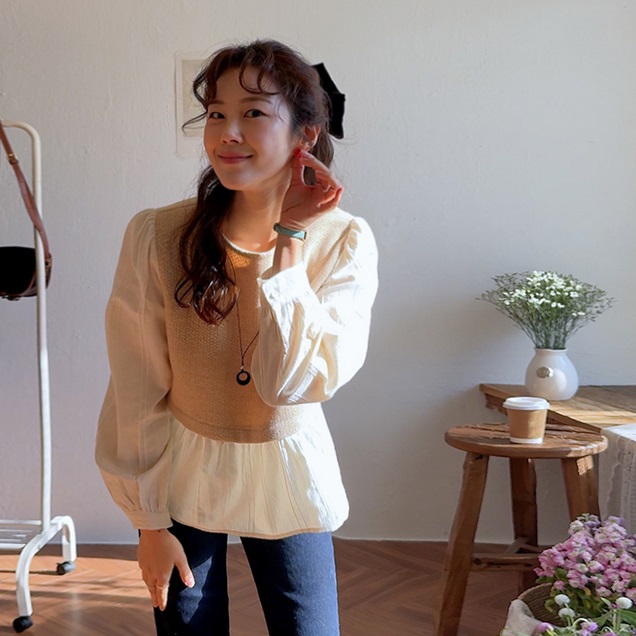 正韓 A字荷葉邊 斜紋褶皺襯衫拼接上衣【B23219】 | Foreverkids 韓國時尚精品、韓國代購、正韓空運、洋裝、吊帶褲、外套、針織外套、寬褲