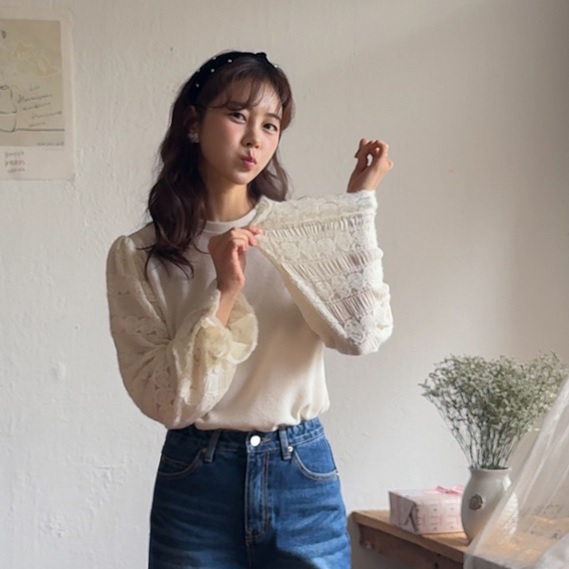 正韓 柔軟甜美蕾絲泡泡袖針織上衣【A23231】 | Foreverkids 韓國時尚精品、韓國代購、正韓空運、洋裝、吊帶褲、外套、針織外套、寬褲