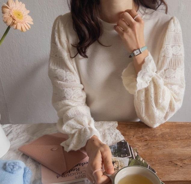 正韓 柔軟甜美蕾絲泡泡袖針織上衣【A23231】