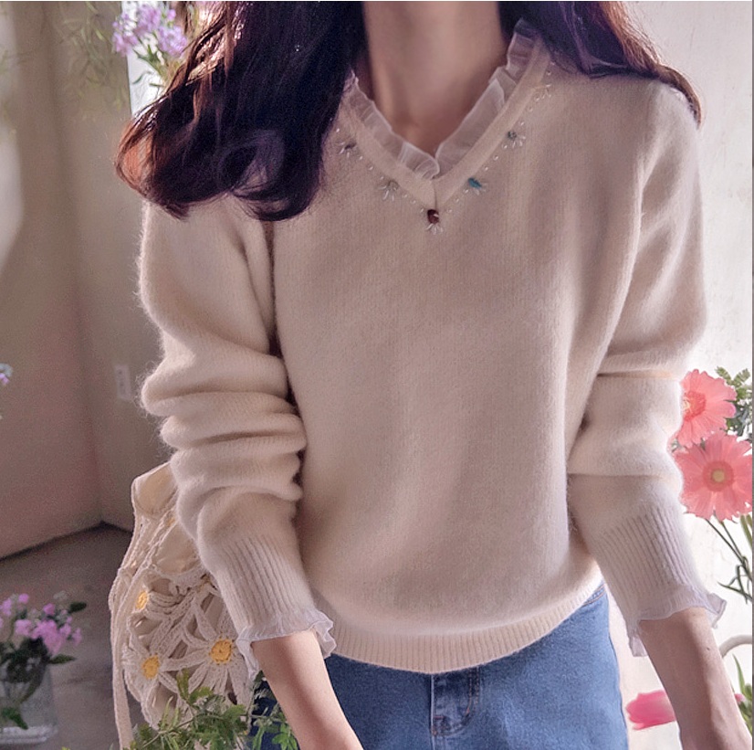 正韓 拼接寶石領袖 荷葉邊寬鬆羊毛針織衫【T72327】韓國代購 | Foreverkids 韓國時尚精品、韓國代購、正韓空運、洋裝、吊帶褲、外套、針織外套、寬褲