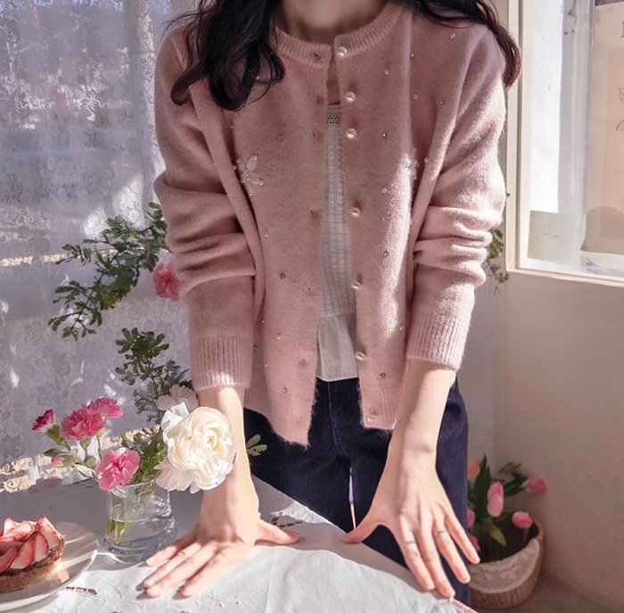 首頁 > 全部商品 > 正韓 花朵點綴閃亮水鑽珍珠開襟針織外套【FS72328】韓國代購