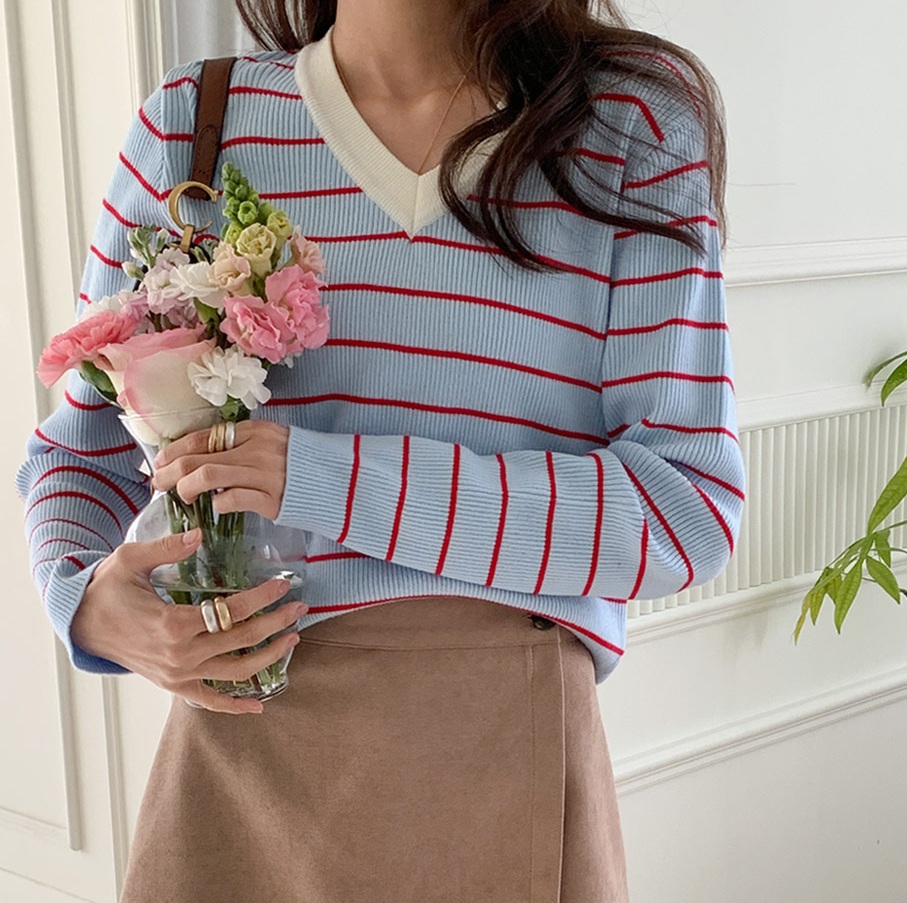 正韓 亮眼彩色 V領配色彈性條紋上衣【A73401】韓國代購 | Foreverkids 韓國時尚精品、韓國代購、正韓空運、洋裝、吊帶褲、外套、針織外套、寬褲