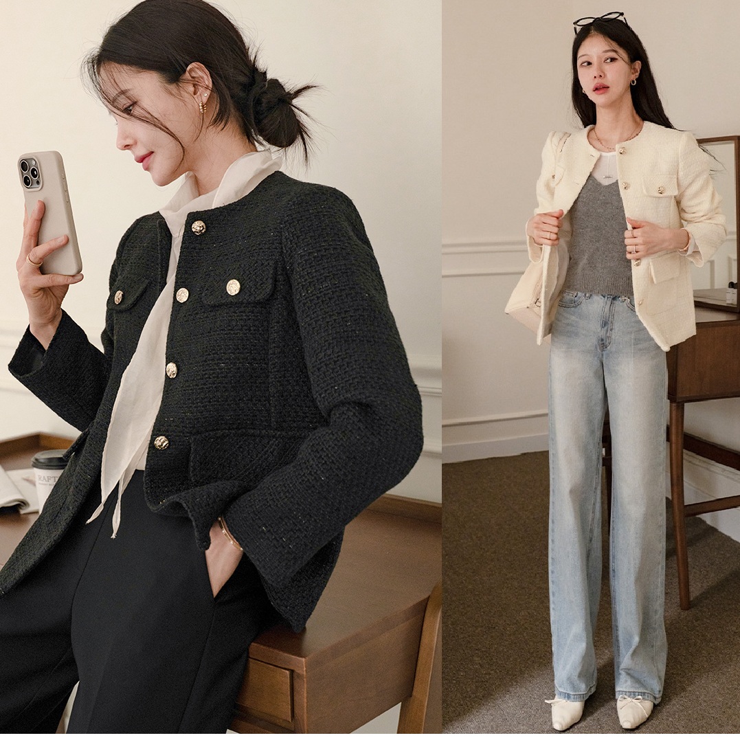 正韓 斜紋軟呢長版金扣小香氣質外套【B74401】韓國代購 | Foreverkids 韓國時尚精品、韓國代購、正韓空運、洋裝、吊帶褲、外套、針織外套、寬褲