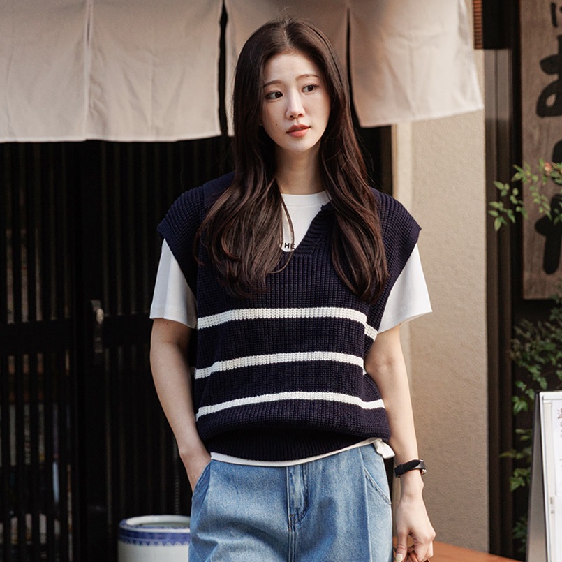 正韓 翻領V領條紋針織寬鬆背心【A74603】 | Foreverkids 韓國時尚精品、韓國代購、正韓空運、洋裝、吊帶褲、外套、針織外套、寬褲