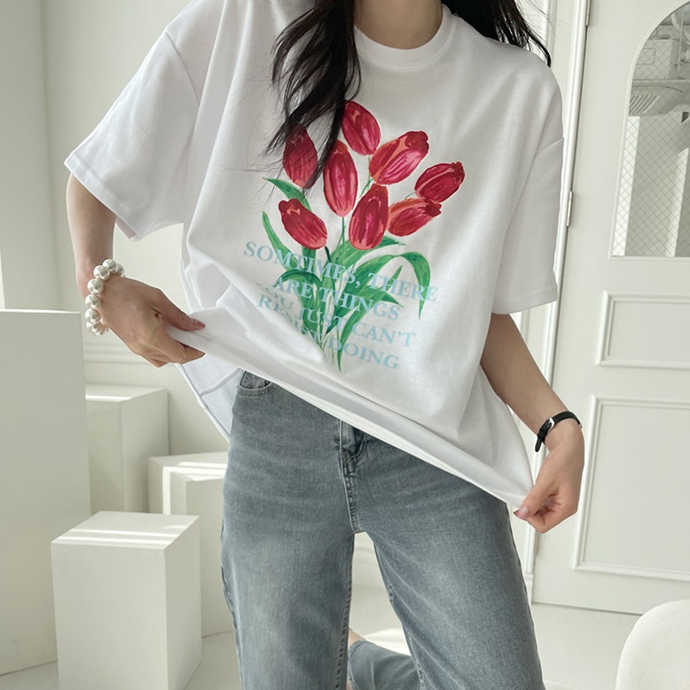 正韓 注目配色花朵短袖寬鬆T【FA40376】