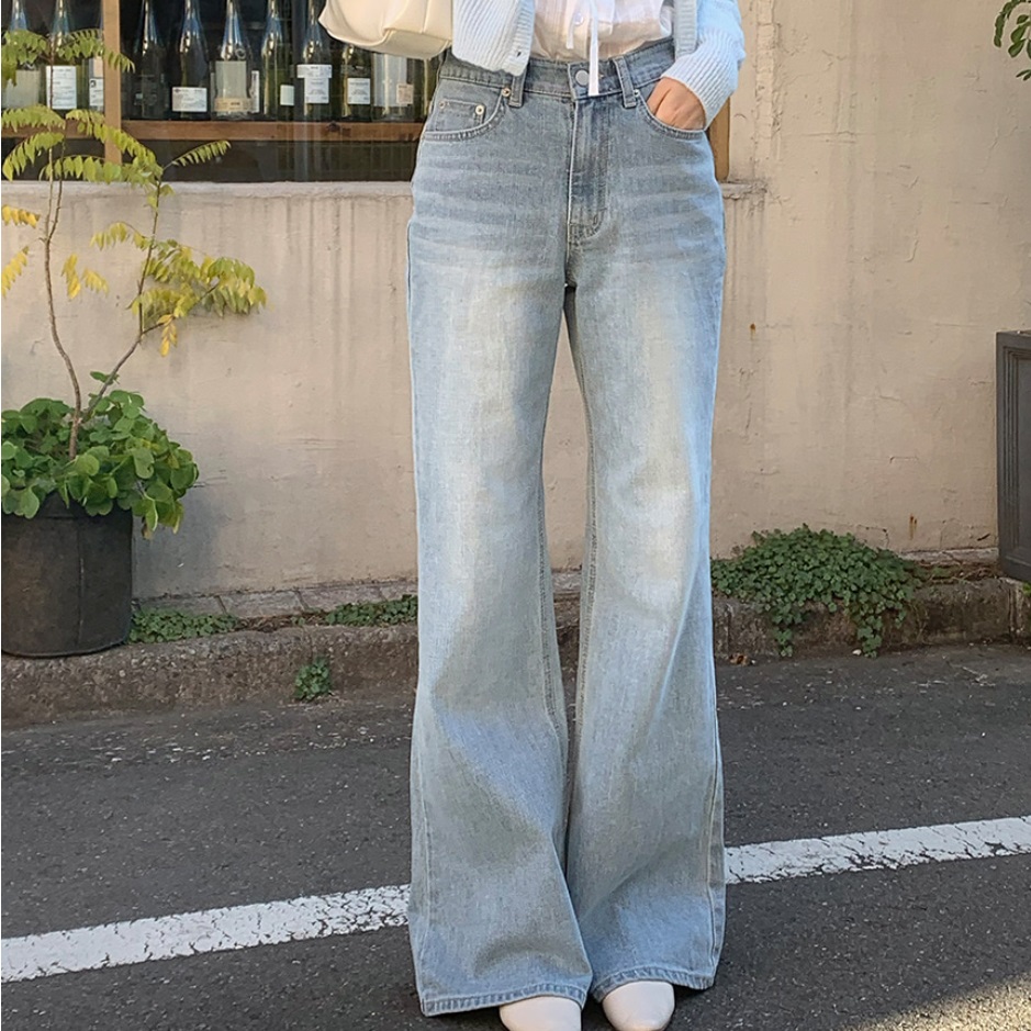 正韓 水洗淺藍牛仔修身 牛仔喇叭褲【A74702】