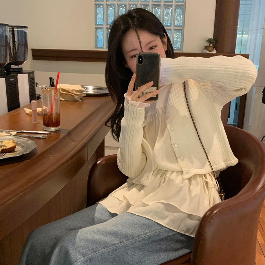 正韓 拼接蕾絲荷葉V領微波浪剪裁 針織外套【A74705】 | Foreverkids 韓國時尚精品、韓國代購、正韓空運、洋裝、吊帶褲、外套、針織外套、寬褲