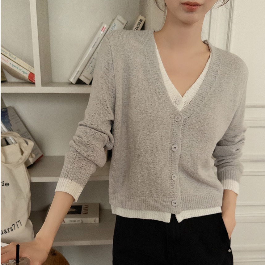 正韓 假兩件配色針織V領開襟外套【A74248】 | Foreverkids 韓國時尚精品、韓國代購、正韓空運、洋裝、吊帶褲、外套、針織外套、寬褲