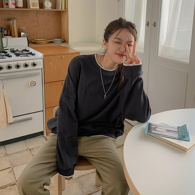 正韓 蕾絲拼接領口 寬鬆內刷毛T衛衣上衣【B72902】韓國代購