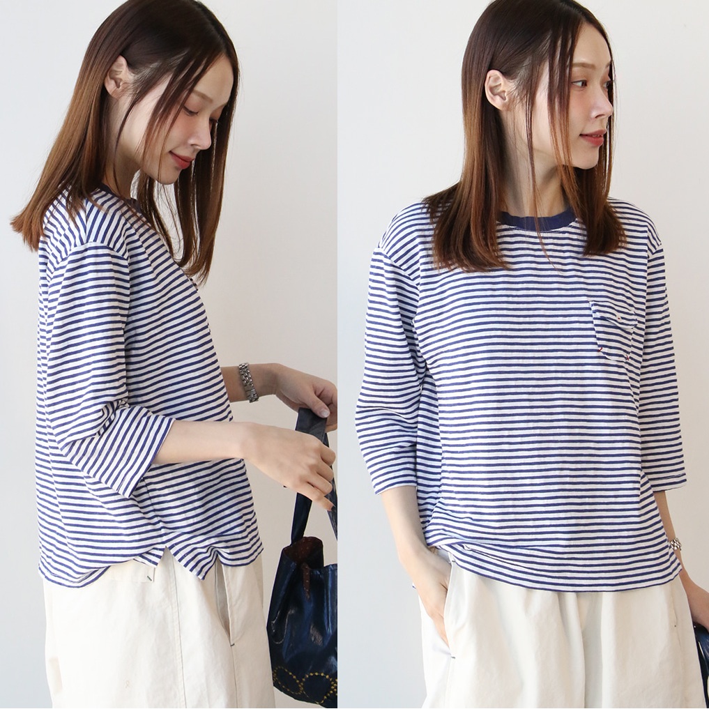 正韓 休閒自然水洗條紋 口袋配色T七分袖上衣【C74359】韓國代購 | Foreverkids 韓國時尚精品、韓國代購、正韓空運、洋裝、吊帶褲、外套、針織外套、寬褲