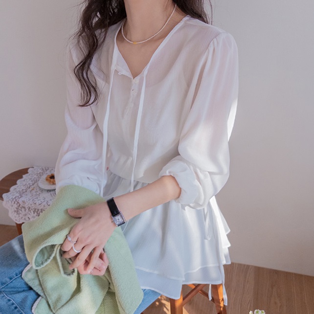 首頁 > 全部商品 > 正韓 輕薄透視修身綁帶雪紡襯衫 【A75209】