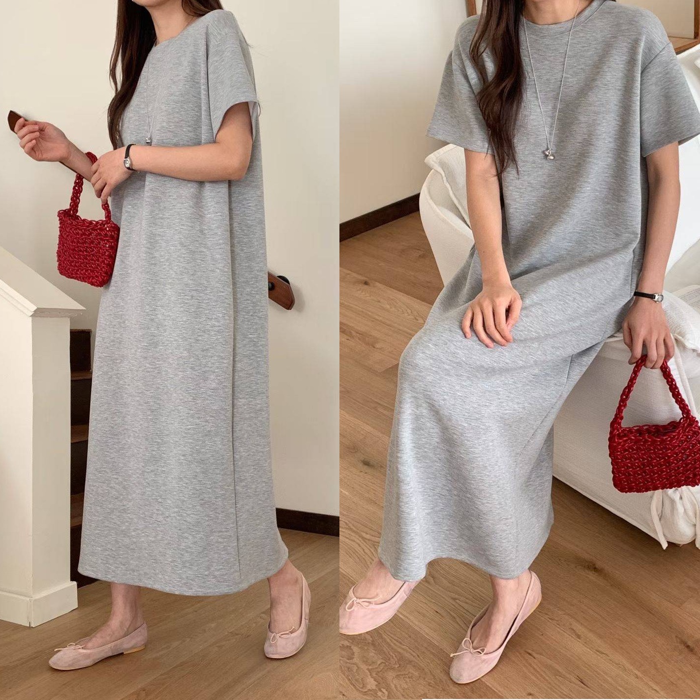 正韓 簡約後下擺開岔 圓領長版T 連身裙長洋裝 素面【A75802】韓國代購