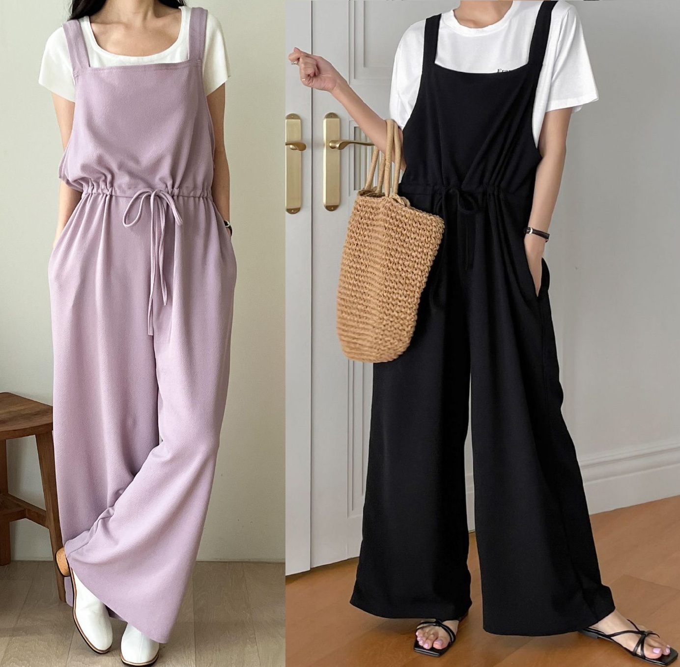 正韓 抽繩腰平口吊帶褲-腰無袖連身褲 寬褲【A75805】韓國代購
