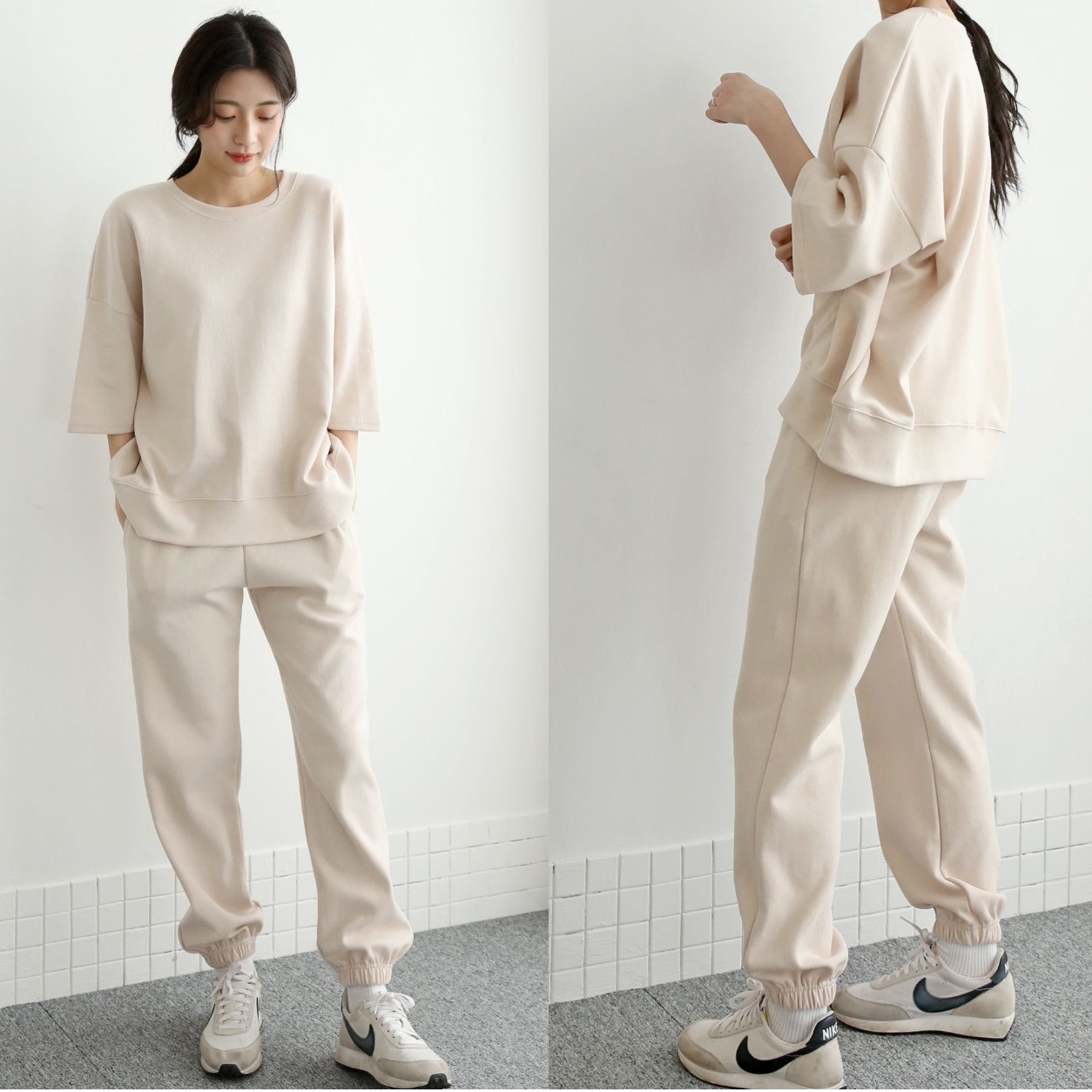正韓 一套!落肩寬鬆T五分袖上衣+縮口褲 套裝運動【A75807】韓國代購