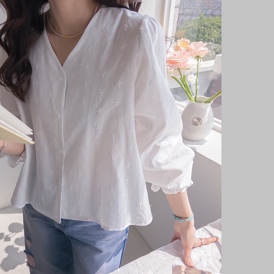 正韓 唯美V領刺繡摺邊白襯衫【E75261】韓國代購 | Foreverkids 韓國時尚精品、韓國代購、正韓空運、洋裝、吊帶褲、外套、針織外套、寬褲