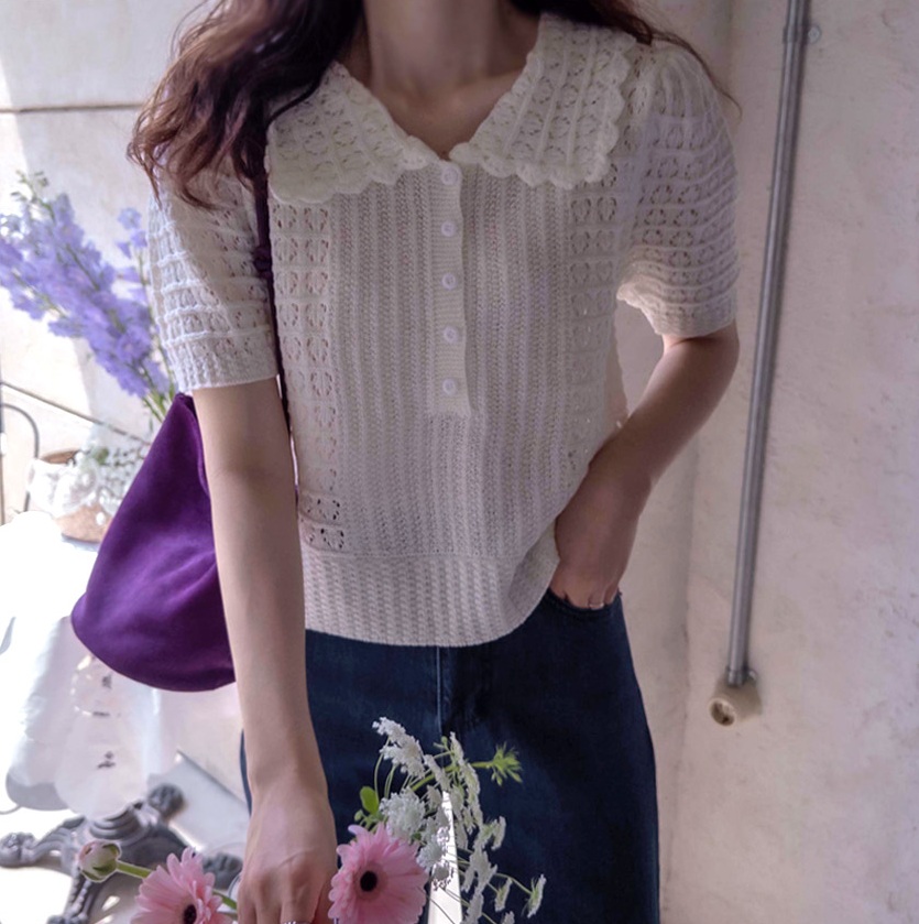 正韓 波浪領 鏤空彈性翻領針織衫【E75262】 | Foreverkids 韓國時尚精品、韓國代購、正韓空運、洋裝、吊帶褲、外套、針織外套、寬褲