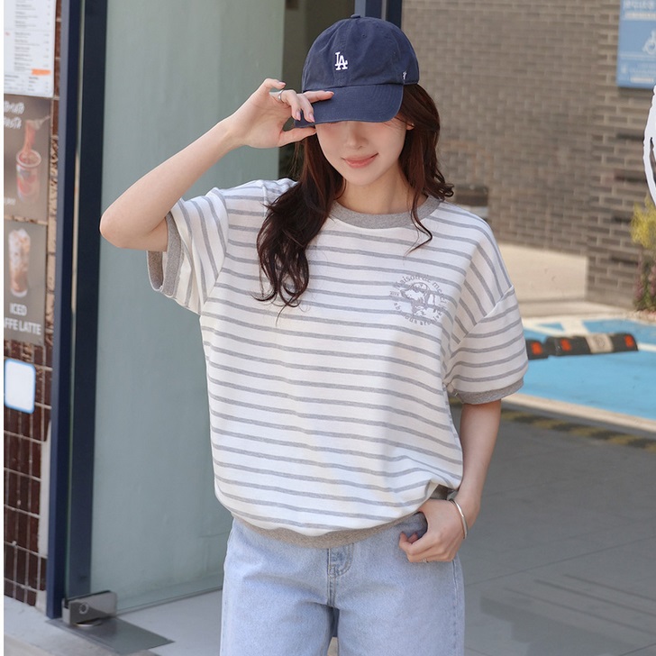 正韓 拚色條紋刺繡五分袖上衣T【A75346】 | Foreverkids 韓國時尚精品、韓國代購、正韓空運、洋裝、吊帶褲、外套、針織外套、寬褲