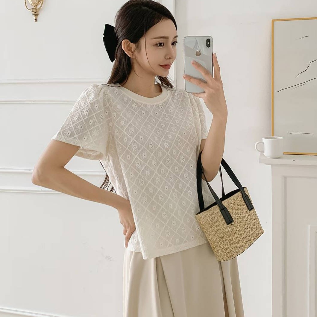 正韓 氣質抓褶花朵壓紋上衣【E75353】韓國代購 | Foreverkids 韓國時尚精品、韓國代購、正韓空運、洋裝、吊帶褲、外套、針織外套、寬褲