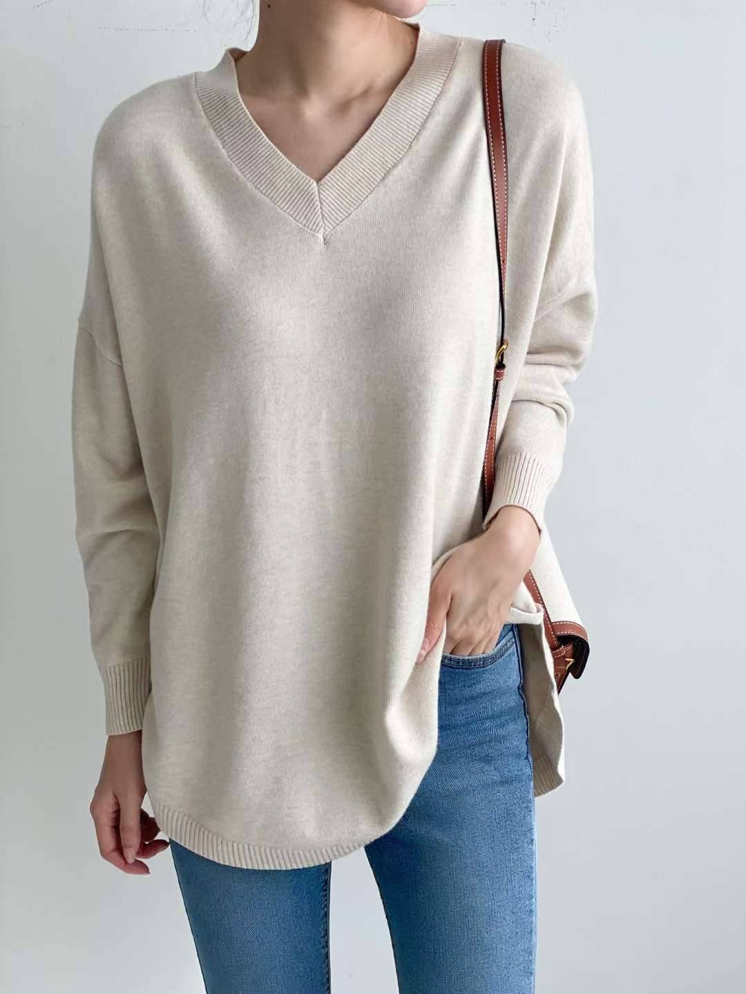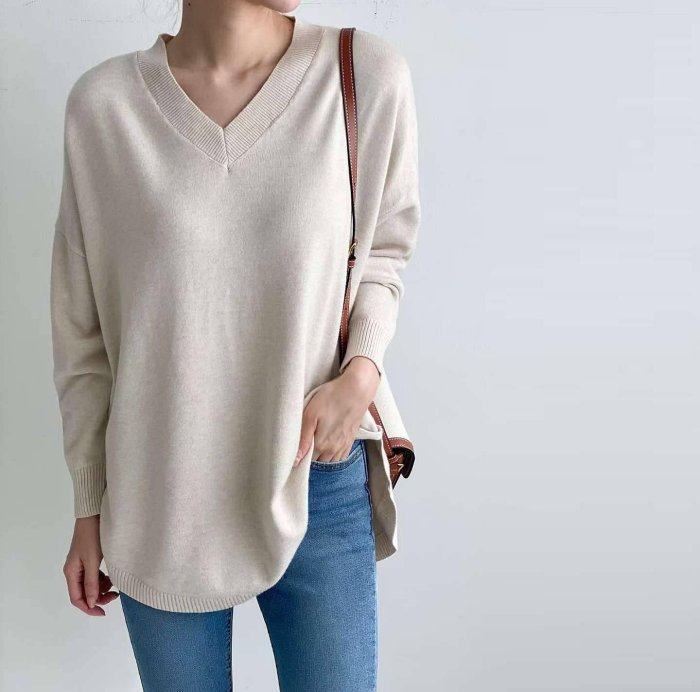 Forever Kids 正韓 柔軟V領落肩長版開岔下擺 針織上衣【A621362】韓國代購 | Foreverkids 韓國時尚精品、韓國代購、正韓空運、洋裝、吊帶褲、外套、針織外套、寬褲