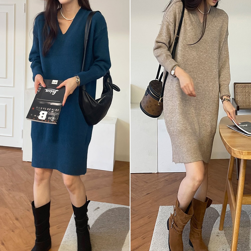 Forever Kids 正韓 簡約V領彈性連身裙 洋裝【A621307】 | Foreverkids 韓國時尚精品、韓國代購、正韓空運、洋裝、吊帶褲、外套、針織外套、寬褲