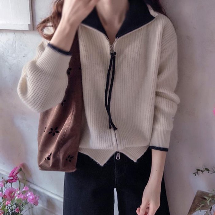 正韓 立領 配色加厚柔軟雙拉鍊 開襟針織外套【B622205】韓國代購 | Foreverkids 韓國時尚精品、韓國代購、正韓空運、洋裝、吊帶褲、外套、針織外套、寬褲