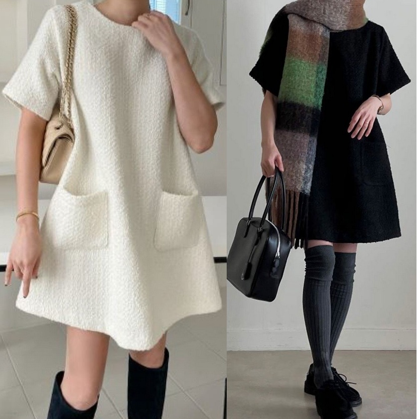 正韓 簡約氣質 背拉鍊口袋花呢 小洋裝混羊毛連身裙 宴會婚禮【DE622238】韓國代購 | Foreverkids 韓國時尚精品、韓國代購、正韓空運、洋裝、吊帶褲、外套、針織外套、寬褲