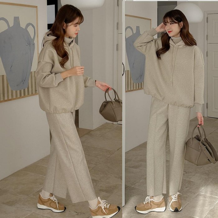 正韓 一套!有厚度 羊毛連帽螺紋高領保暖上衣+線條寬褲 套裝【A423362】 韓國代購