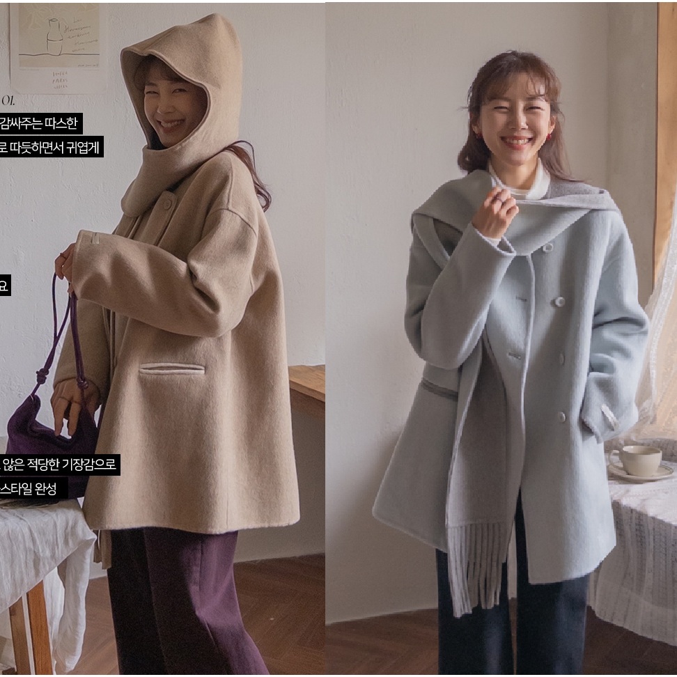 正韓 70%羊毛 手工羊毛外套 披肩連帽圍巾 長版圓領大衣外套【C622373】 | Foreverkids 韓國時尚精品、韓國代購、正韓空運、洋裝、吊帶褲、外套、針織外套、寬褲
