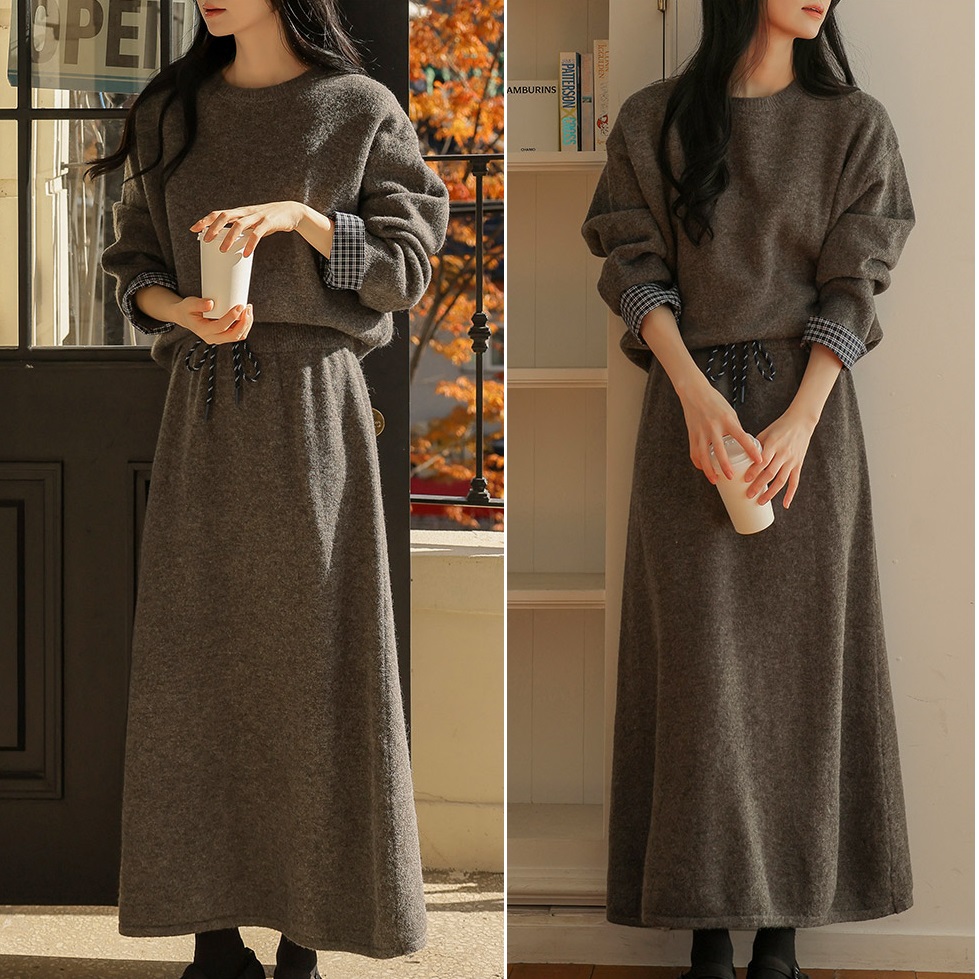 正韓 一套! 拼接格紋針織上衣 A字針織長裙 套裝【J622382】 | Foreverkids 韓國時尚精品、韓國代購、正韓空運、洋裝、吊帶褲、外套、針織外套、寬褲