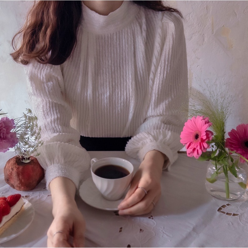 正韓 袖口鈕扣 柔美線條絲絨半高領上衣【B622391】 | Foreverkids 韓國時尚精品、韓國代購、正韓空運、洋裝、吊帶褲、外套、針織外套、寬褲