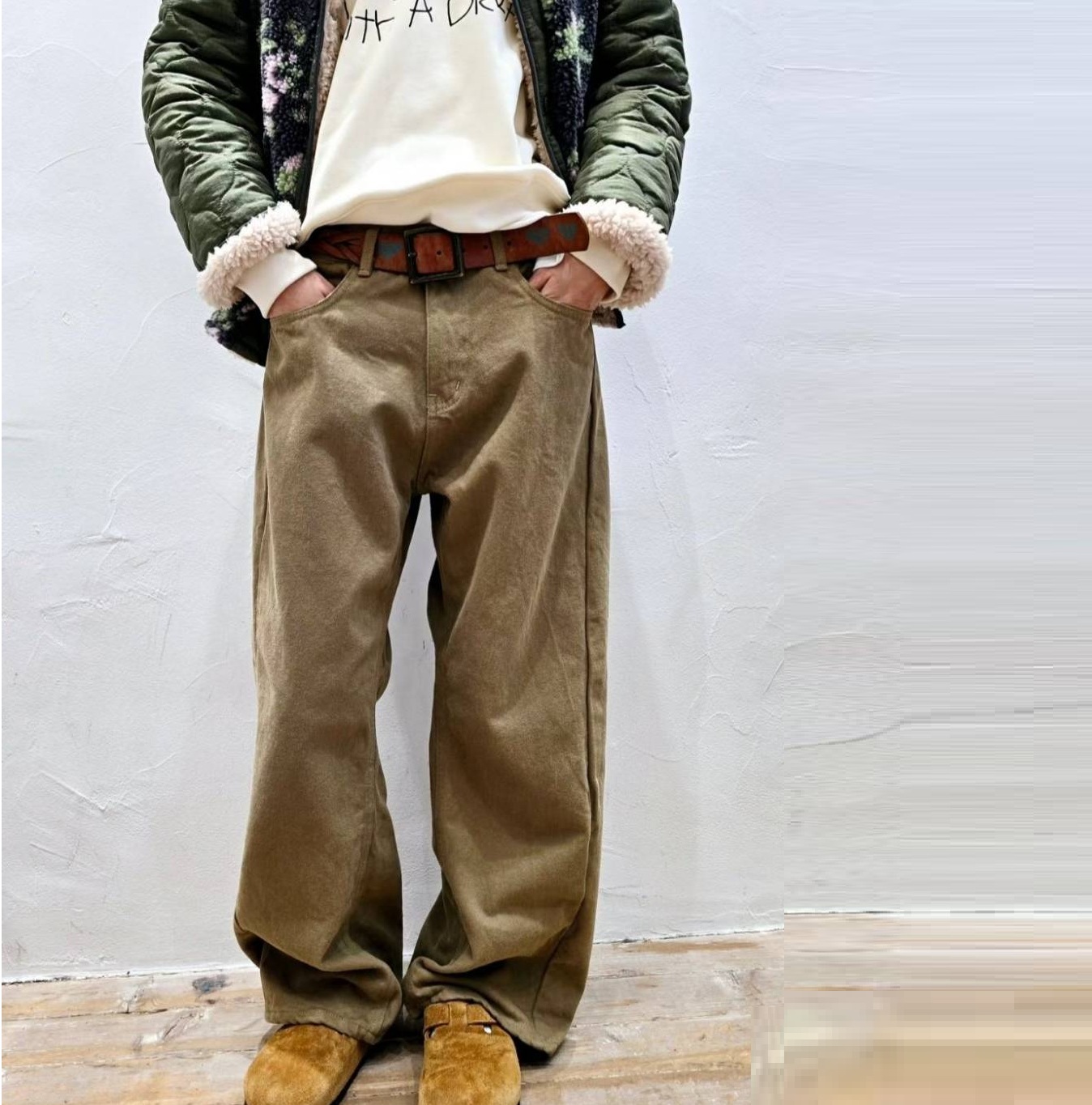 正韓 寬鬆版前車線內磨毛長 牛仔褲 米/白色【B323271】韓國代購