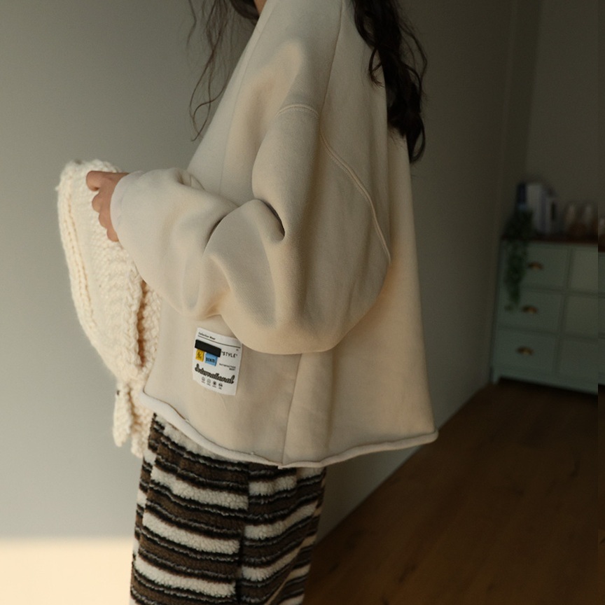 正韓 V領內刷毛標籤落肩T上衣【ES23205】韓國代購 | Foreverkids 韓國時尚精品、韓國代購、正韓空運、洋裝、吊帶褲、外套、針織外套、寬褲
