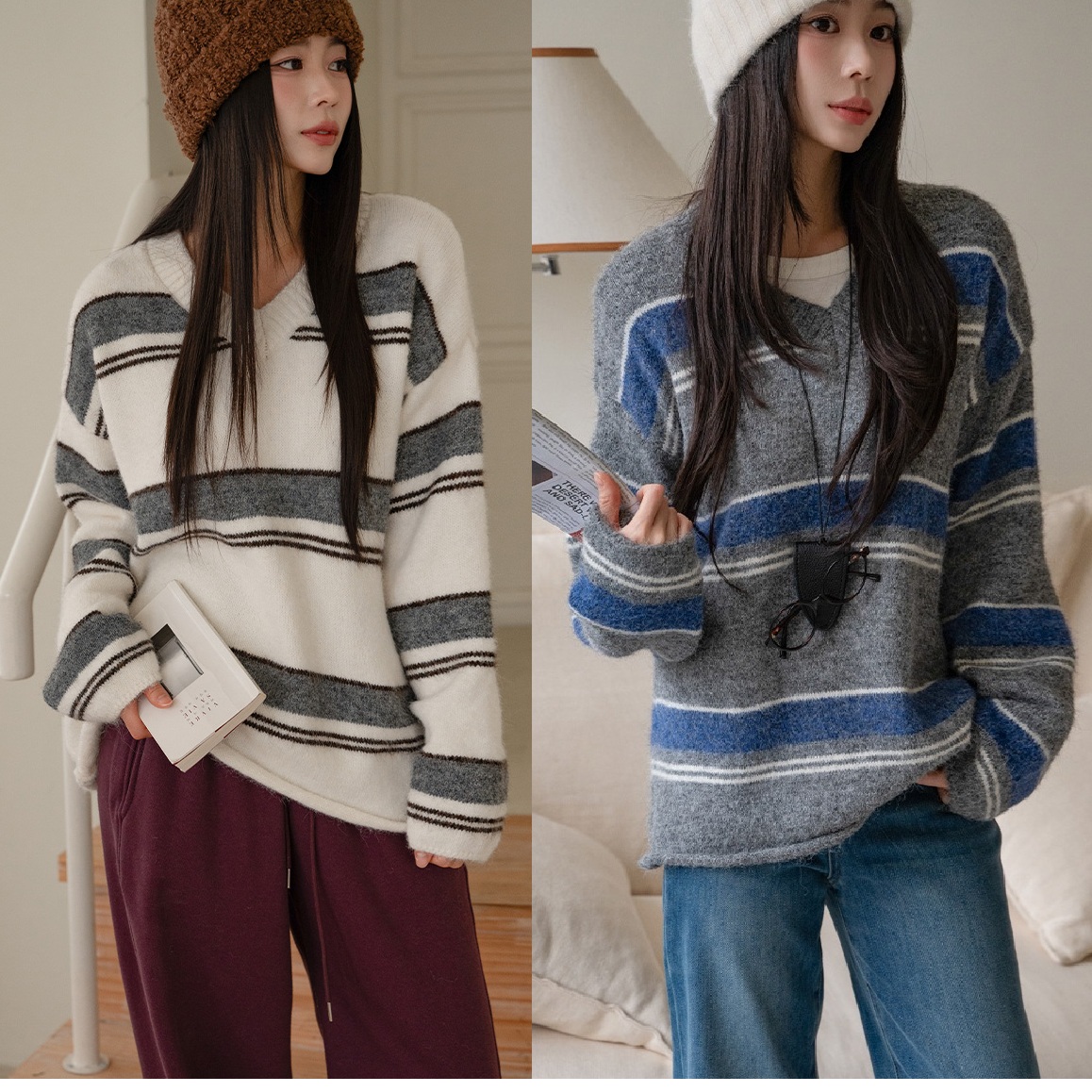 正韓 舒適毛絨V領寬鬆落肩 羊毛針織長版上衣【A7201】韓國代購 | Foreverkids 韓國時尚精品、韓國代購、正韓空運、洋裝、吊帶褲、外套、針織外套、寬褲