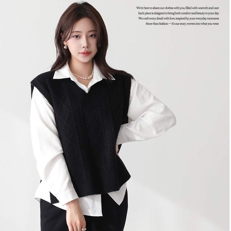 正韓 一套!V領麻花針織側開岔背心 白襯衫套裝【A7203】韓國代購 | Foreverkids 韓國時尚精品、韓國代購、正韓空運、洋裝、吊帶褲、外套、針織外套、寬褲