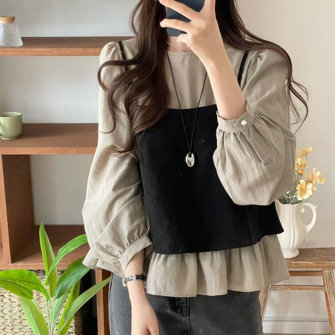 正韓 好看一套抓褶小蓬袖襯衫+背心套裝【A73361】韓國代購