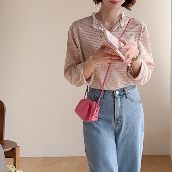 正韓 布蕾絲滾邊亨利領開扣 條紋T上衣【C73378】韓國代購 | Foreverkids 韓國時尚精品、韓國代購、正韓空運、洋裝、吊帶褲、外套、針織外套、寬褲