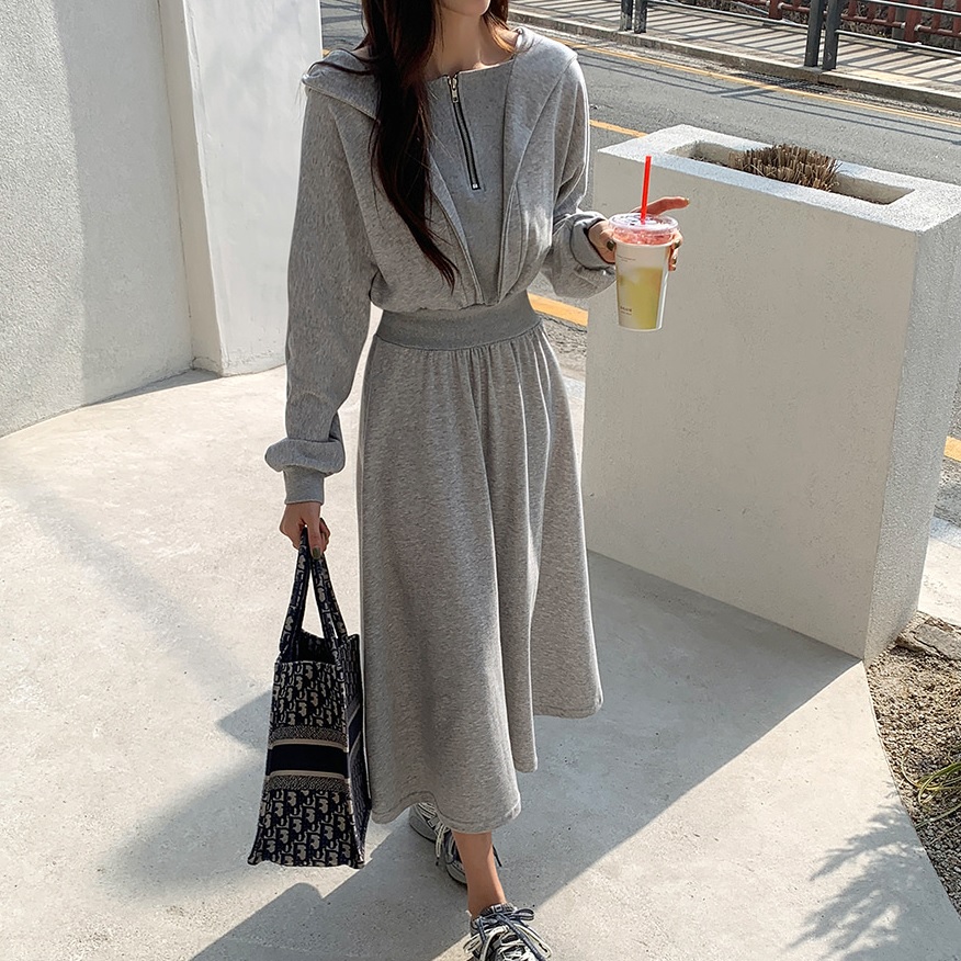 正韓 半拉鍊連帽縮腰 連身裙 套裝【A74373】