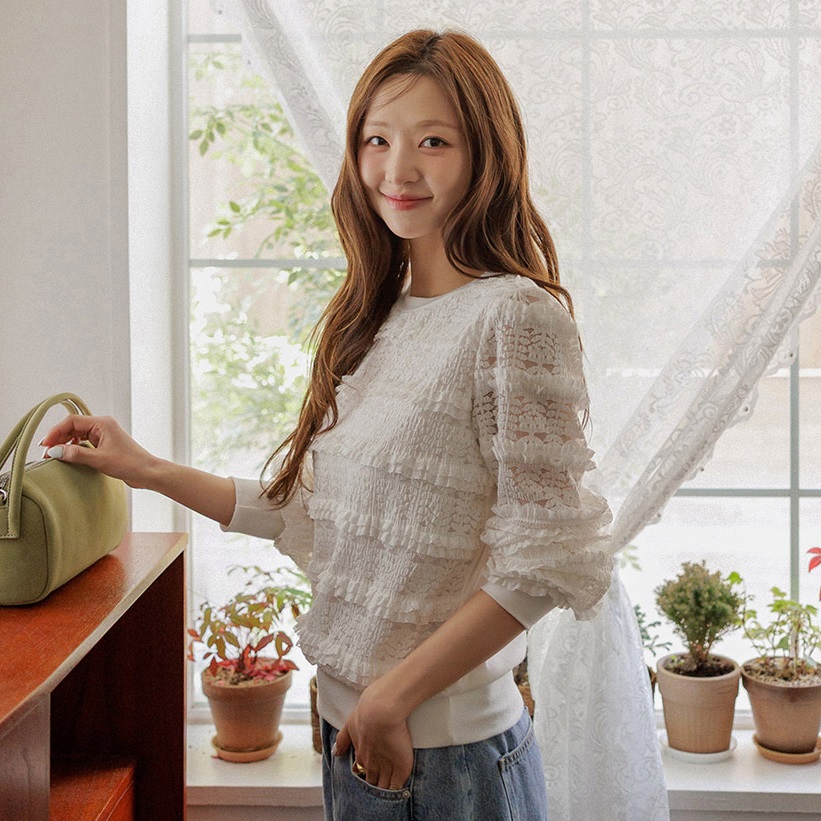 正韓 拼接背鏤空彈性荷葉上衣【A74375】 | Foreverkids 韓國時尚精品、韓國代購、正韓空運、洋裝、吊帶褲、外套、針織外套、寬褲