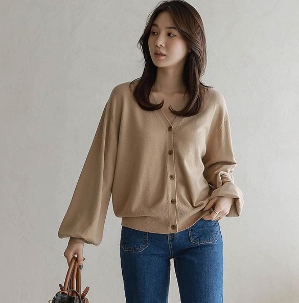 正韓 自然蓬鬆袖V領開襟針織外套【B74381】 | Foreverkids 韓國時尚精品、韓國代購、正韓空運、洋裝、吊帶褲、外套、針織外套、寬褲
